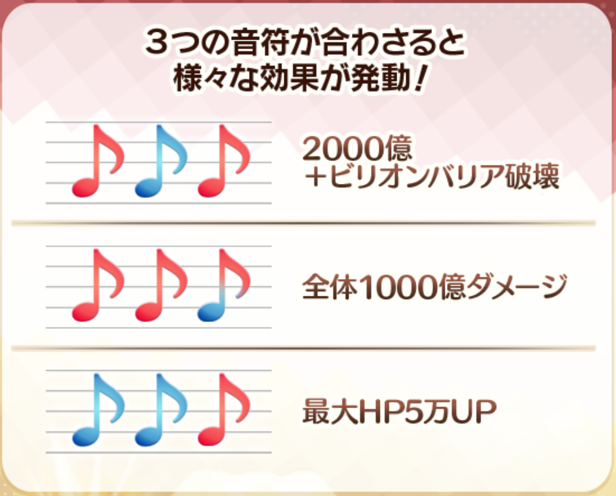 音符が特定の並び順になると、ビリオンバリア破壊や敵全体へのダメージなどの効果を得られるぞ!