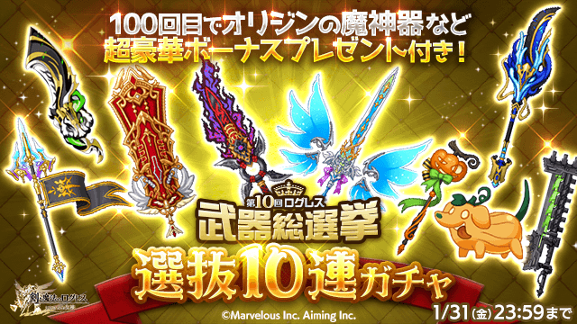 「第10回ログレス武器総選挙」にて上位120位に選ばれた武器のみが「選抜10連ガチャ」と同じ確率で排出!