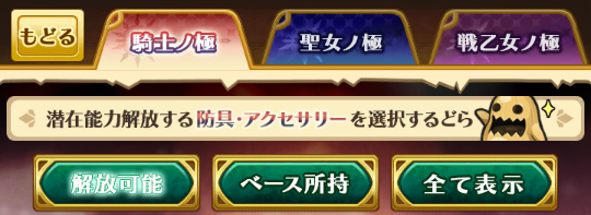 潜在能力解放は一部の防具・アクセサリーシリーズに対応しており、「騎士ノ極」「聖女ノ極」「戦乙女ノ極」の中から1つを選んで秘められたEXスキルを解放します。