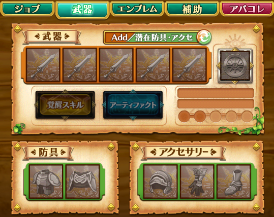 装備画面で「Main/通常防具・アクセ」ボタンをタップすると、Add武器枠&潜在防具・アクセ枠の画面に切り替えることができます。