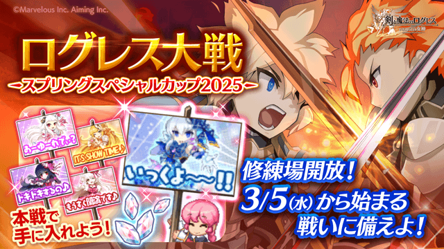 2025/3/5(水)22:00より、「ログレス大戦 スプリングスペシャルカップ2025」の開催が決定!来る本戦に向けて、「ログレス修練場」で戦いに備えよう!