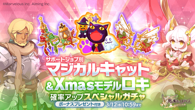 期間中、ガチャの「オススメ」タブにて「サポートジョブ別 マジカルキャット&Xmasモデルロキ確率アップスペシャルガチャ」を販売します。