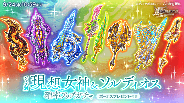 期間中、ガチャの「オススメ」タブにて「ジョブ別 現想女神&ソルディオス確率アップガチャ」を販売します。