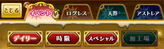 一部イベントや期間限定のクエストが表示され、クエスト種別によって「デイリー」「時限」「スペシャル」「加工場」の4種類に分かれます。