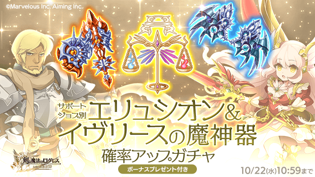 期間中、ガチャの「オススメ」タブにて、「サポートジョブ別 エリュシオン&イヴリースの魔神器確率アップガチャ」を販売します。