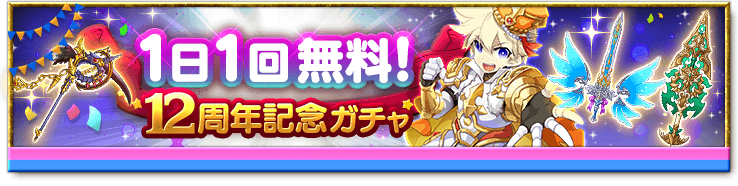 期間中、ガチャの「オススメ」タブにて、1日1回無料で利用することができる「1日1回無料!12周年記念ガチャ」を実施します。
