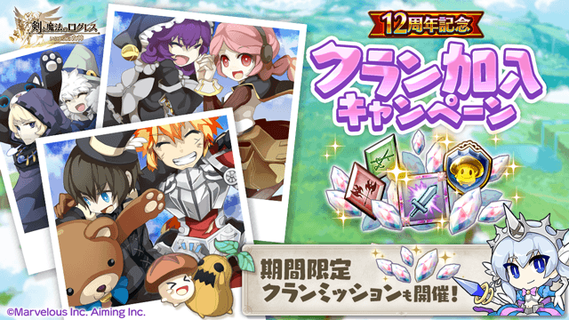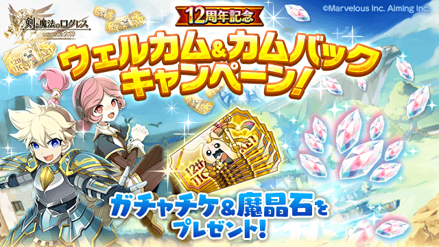 今ログレスを始めるor戻ってくると、魔晶石50個と「12周年記念ガチャチケット」100枚がもらえます!
