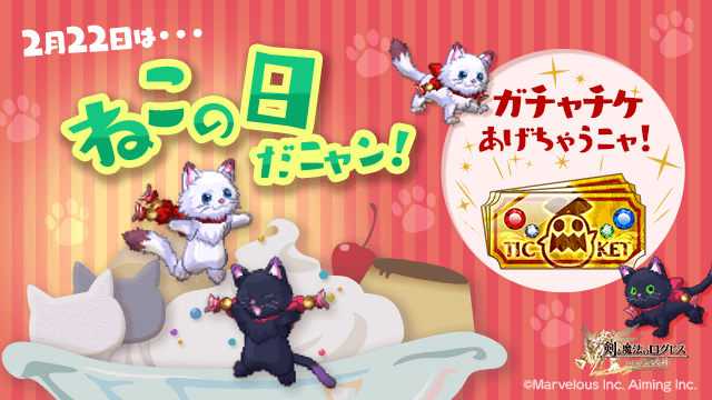 お知らせ 2026年02月22日(日) クエスト 2月22日はニャンニャンニャンの日♪ 期間中、「イベント」タブにて「ねこの日だニャン!」を開催します。 ねこの日記念♡ フェリス&ミスティから、バレンタインガチャチケット22枚などの贈り物をもらっちゃおう! ※バレンタインチケットガチャの詳細はこちらをご確認ください。 期間 2026/2/22(日)0:00~2/24(火)23:59まで 注意事項 ※メンテナンス日程および期間、内容は変更となる場合があります。 リスト