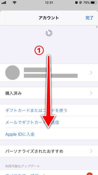 3.「アカウント」画面を下に引っ張って(スワイプして)更新を確認する(図①)